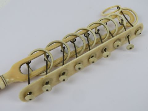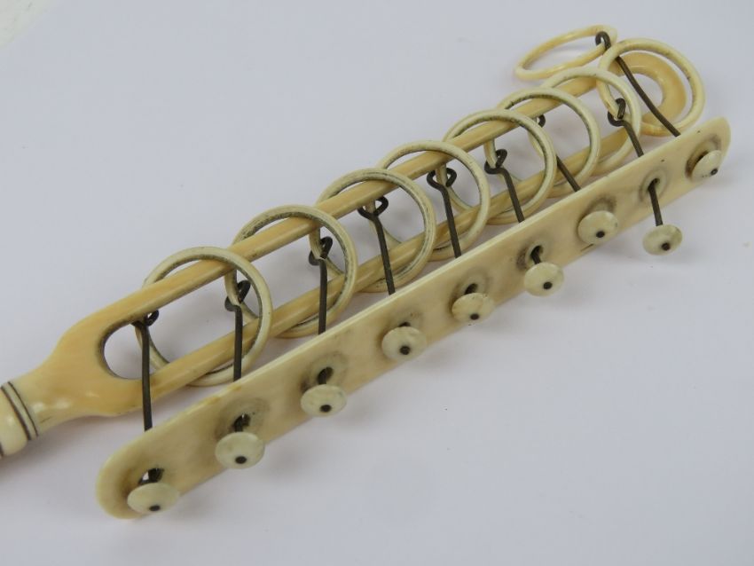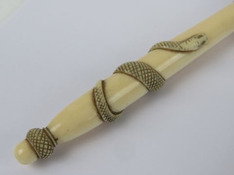 A 19thC ivory rattle having carved serpent design to handle and measuring 25.5cm in length.