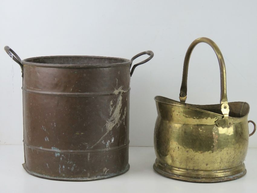 A copper coal bucket, 32cm dia with brass end handles, together with a brass coal bucket having swing handle over. Two items.