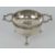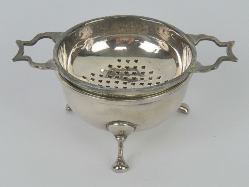 An HM silver tea strainer and bowl raised over three feet, hallmarked Birmingham 1931, 47.1g / 1.52ozt.