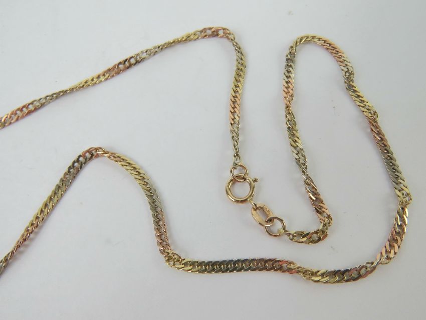A 9ct gold tri-colour flattened curb link chain necklace, hallmarked 375, 42cm in length, 4g.