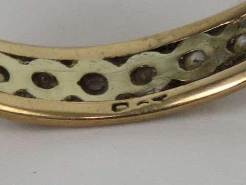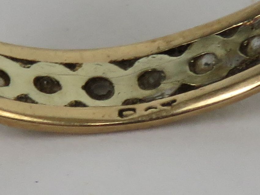 A Victorian rose metal ring set with seed pearls a/f, together with a 9ct gold eternity ring size M. Total weight 3.4g.