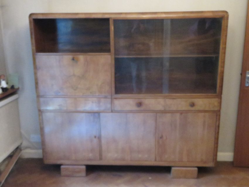 A good Art Deco offset cabinet comprising open shelf, fall front drinks cabinet with cupboards under, sliding glazed panels having shelves within. Walnut, 180 x 39 x 164cm, raised on block feet.