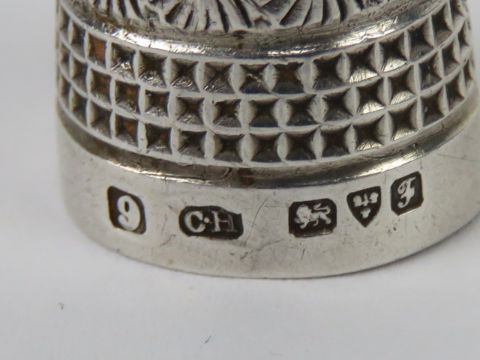 Two HM silver thimbles together with a glass perfume bottle having HM silver top. Three items.