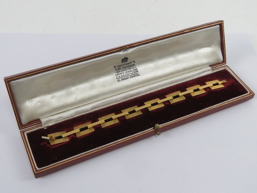 An 18ct gold geometric articulated panel bracelet having bark effect and poloshed rectangular links, hallmarked 750, 18.5cm in length, 32.7g. In original fitted Garrard & Co presentation box.