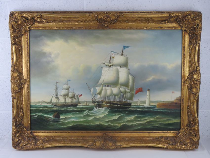 A 20thC oil on canvas; Maritime scene of masted sailing ships leaving port in a fair wind. Unsigned. In large decorative gilt frame 60 x 90cm,