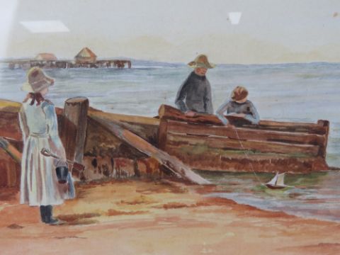 Watercolour by Jean Wheeler being a seaside scene of family with bucket and spade and model boat, sight size 40 x 28cm, framed and mounted.