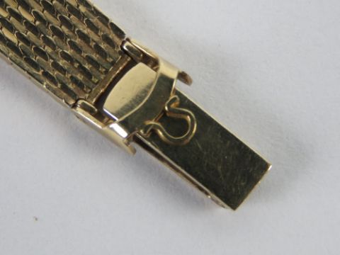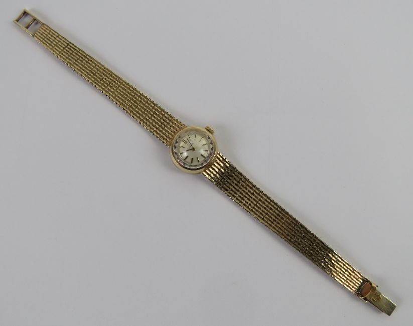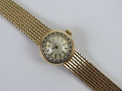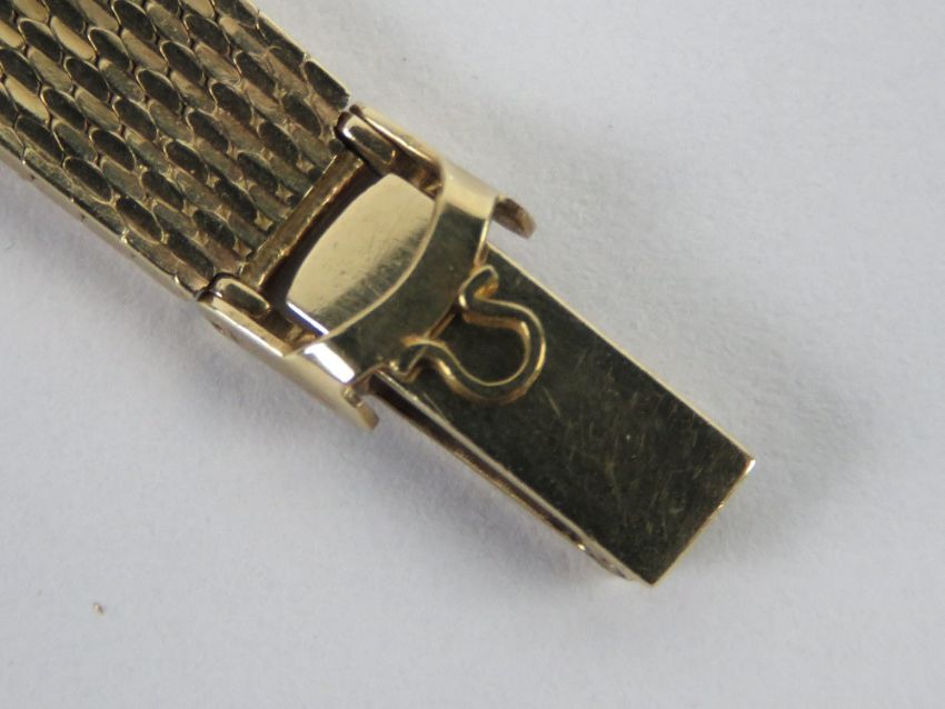 A 9ct gold ladies Omega cocktail wristwatch on integral strap, hallmarked 375, having cream dial with yellow metal numerals, dial, strap and crown wheel all bearing Omega symbol upon. Total weight 25.4g.