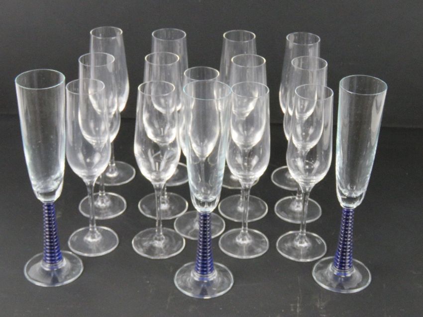 A set of thirteen Stolzle Champagne flutes together with a set of three Champagne flutes having blue glass stems.