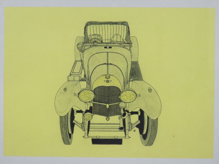 A pair of pen and ink drawings of vintage motor cars, one being a Bentley, each 42 x 30cm, framed and glazed.