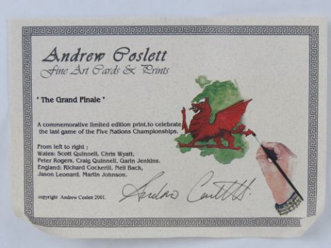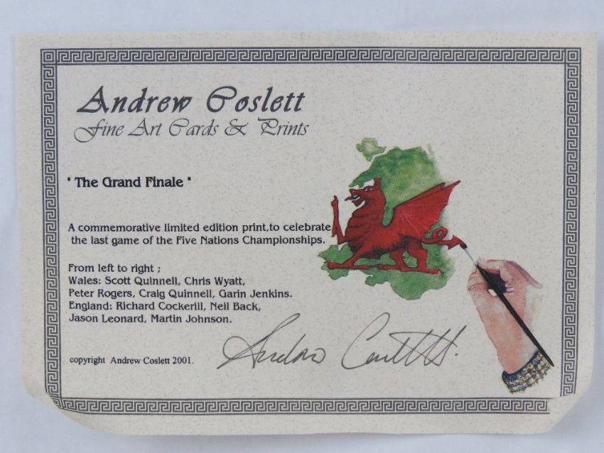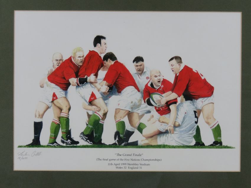 Signed limited edition print 'The Grand Finale' The final game of the Five Nations Championships 11th April 1999, Wembley Stadium Wales 32 England 31 by Andrew Coslett No 18/400, signed in pencil lower left, with certificate verso, sight size 34 x 24cm, framed and mounted.