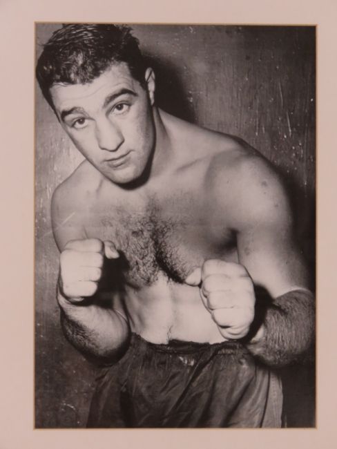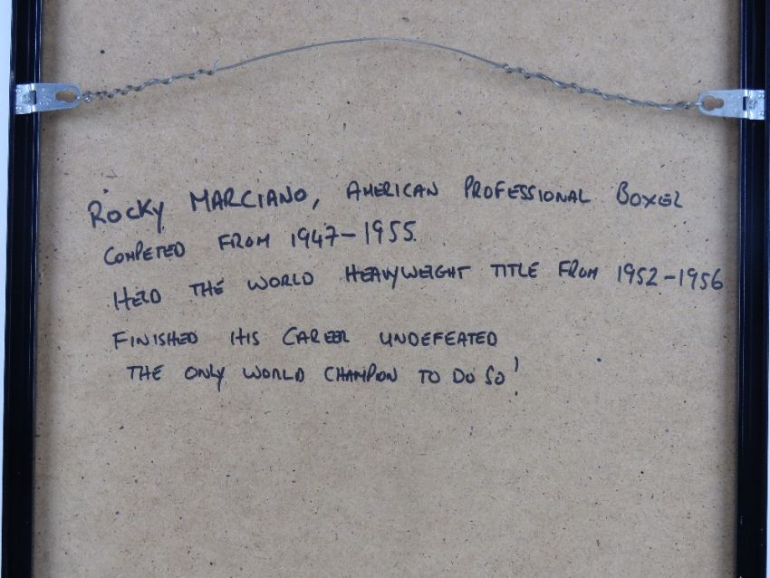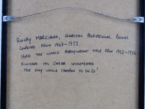 Rocky Marciano photographic print, the American Professional Boxer (Heavyweight title 1952-1956 undefeated!) in bare knuckle pose, sight size 35 x 24.5cm, framed and mounted.