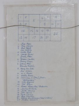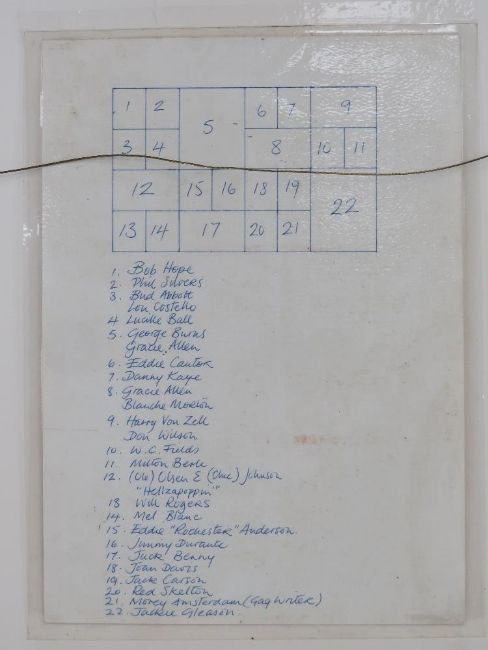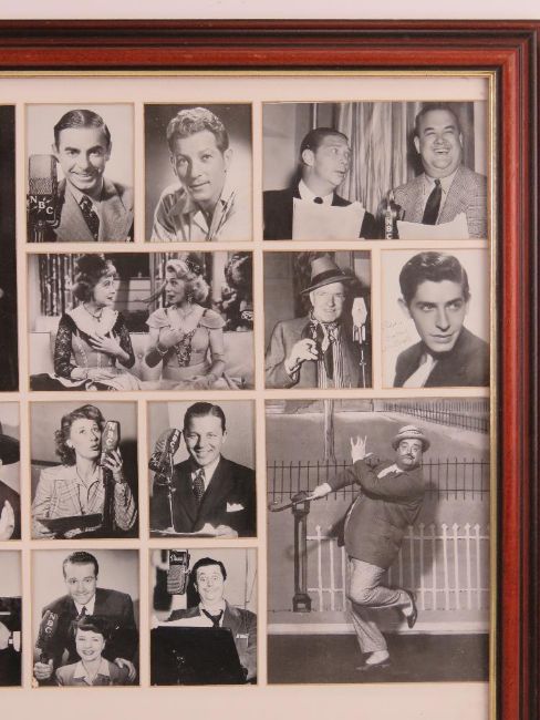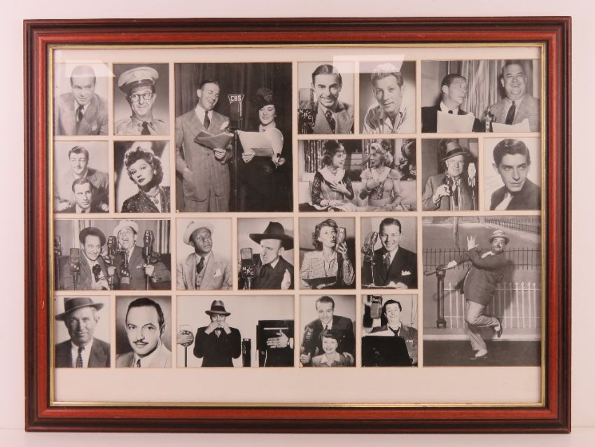 A framed montage of black and white photographs featuring actors inc Bob Hope, Lucille Ball, Lou Costello, etc, with full list verso, frame measuring 78 x 59cm.