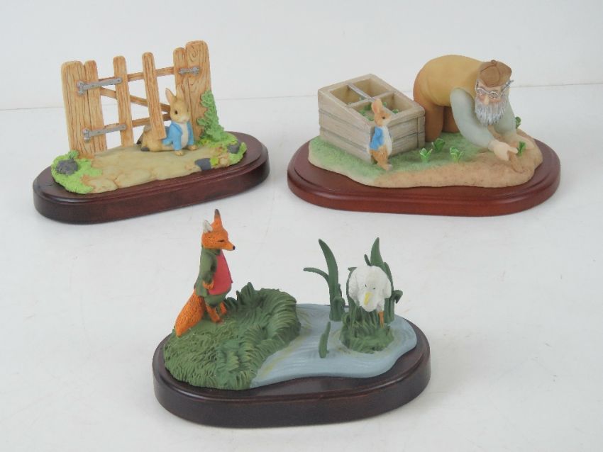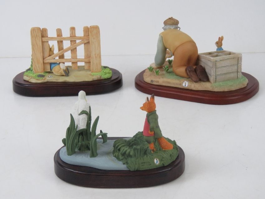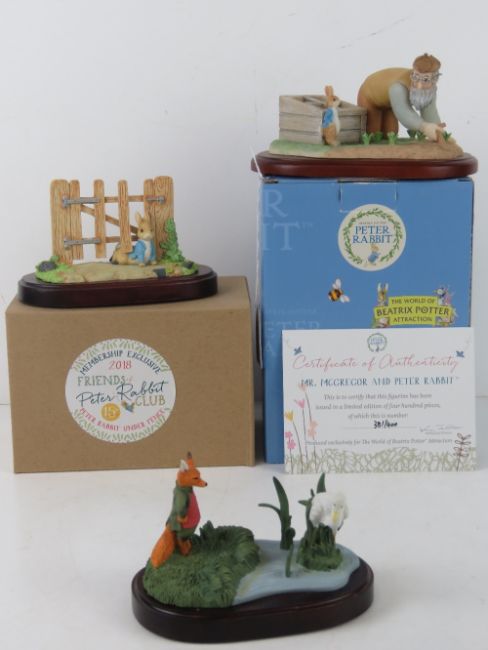 Enesco Beatrix Potter; Limited Edition figurine 'Mr McGregor and Peter Rabbit' A28331, no 381/400, approx 14cm wide with box and certificate. Together with two Friends of Peter Rabbit Club member only figurines being 'Fox & Stork' A29530 and 'Peter Rabbit Under Fence' (with box) A28982. Three items.