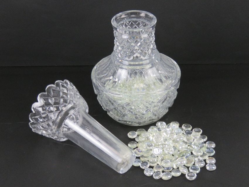 A lead crystal heavy cut glass two sectional lily vase, containing a quantity of glass beads, 28cm high. Together with an associated lead crystal cut glass circular stand 31cm dia.
