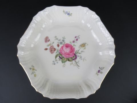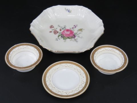 A Royal Copenhagen creamware bowl floral decoration throughout and part gilded, together with three items of Royal Doulton gilded creamware bearing backstamp J J Sweeney Houston and being a small saucer dish and two deep dishes.