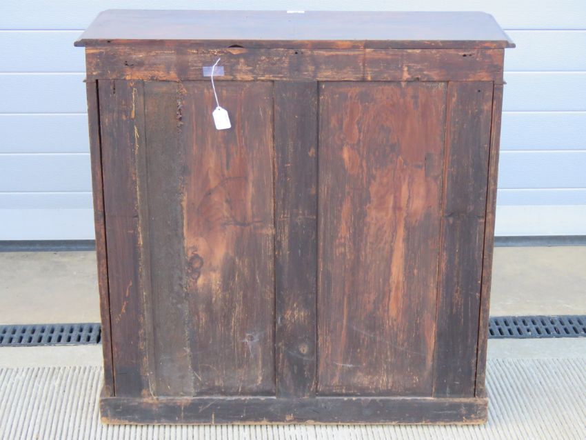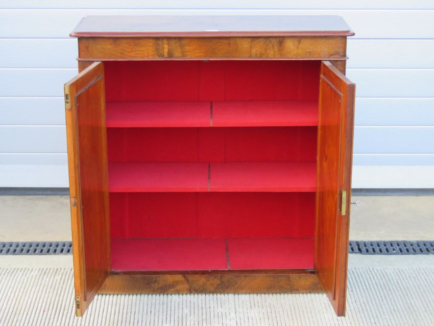 A good walnut half veneered two door floor standing cabinet, twin mirrored doors opening to reveal baize lined shelves within, with key. 88 x 34 x 88cm.