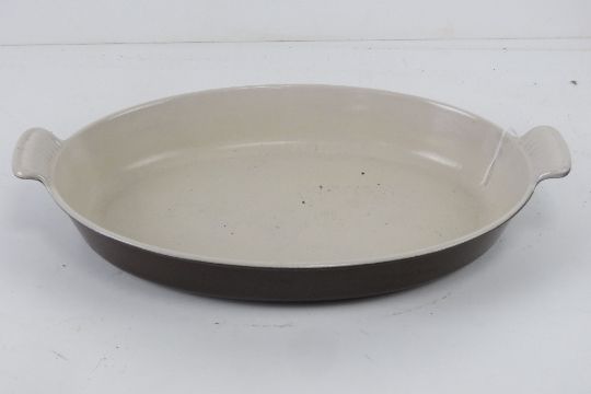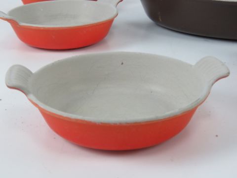 Le Cruset; a large oval oven dish together with a set of eight individual dishes and a teapot lid.
