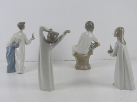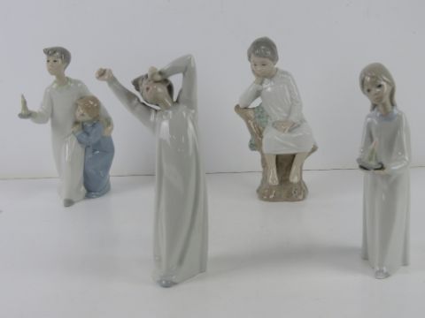 Lladro; Four figurines of children in night clothes, tallest approx 21.5cm high. One hand a/f.