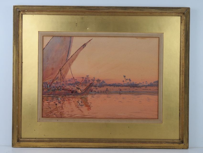 Watercolour; sailboat on the River Nile, palm trees and sunset beyond, signed lower left, in gilt slip and frame, no glass, sight size 51 x 35.5cm, bearing John H Paris label verso.