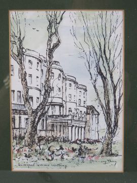 Rosemary Dray; a set of four ink and watercolour scenes of Worthing c1980s, each framed and mounted (one glass a/f), sight size 17 x 10.5cm.