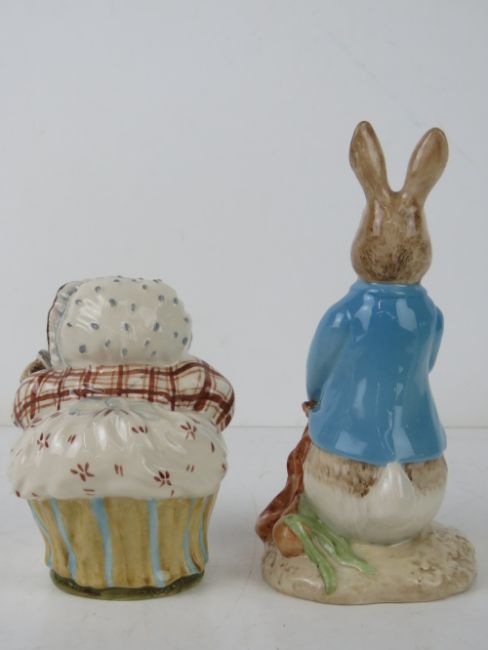 Royal Albert Beatrix Potter; Two large size figurines being 'Peter with Red Pocket Handkerchief', approx 18cm high and 'Mrs Tiggy-Winkle', approx 11.5cm high. Each with original box.