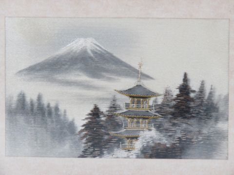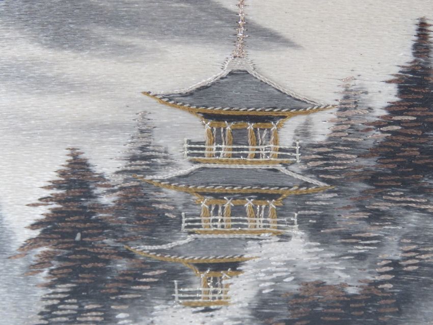 A Japanese silken thread embroidered scene of a pagoda in forest before Mount Fuji, framed and mounted, overall size 30 x 22.5cm.