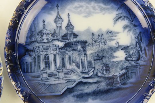 A good pair of blue and white part gilded scenic cabinet plates, un-named, 27cm dia.