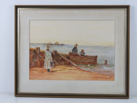 Watercolour by Jean Wheeler being a seaside scene of family with bucket and spade and model boat, sight size 40 x 28cm, framed and mounted.