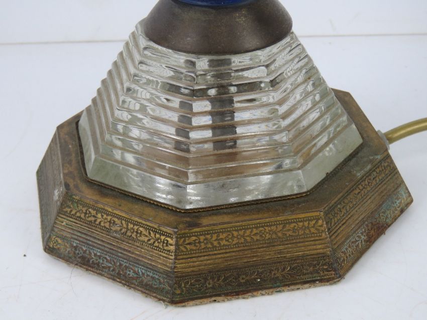 A pale blue early 20thC etched glass vase converted for use as a lamp.