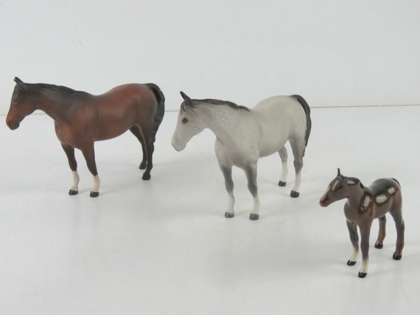 Beswick; A matt dapple grey pony together with another matt finished pony and a glazed foal figurine (small chip to ear noted).