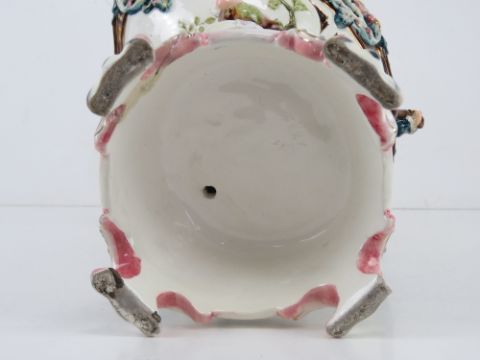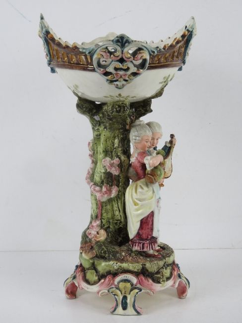 A large Capodimonte style centrepiece pedestal fruit bowl having two figures upon, old staple repair to base, all standing 38cm high.