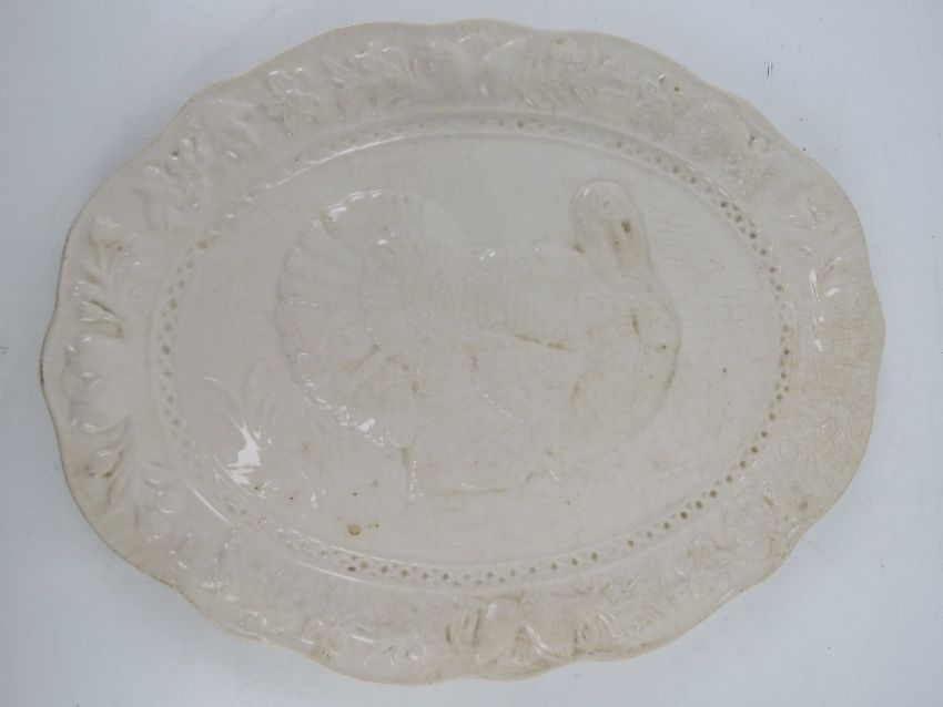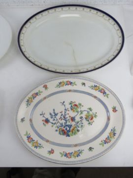 A quantity of assorted large serving plates or meat dishes inc blue and white Brownfield & Sons plate and another having turkey design upon. Five items.