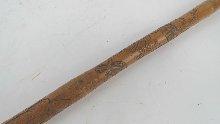 A bamboo swagger stick carved with birds and monkeys upon, 87cm in length.