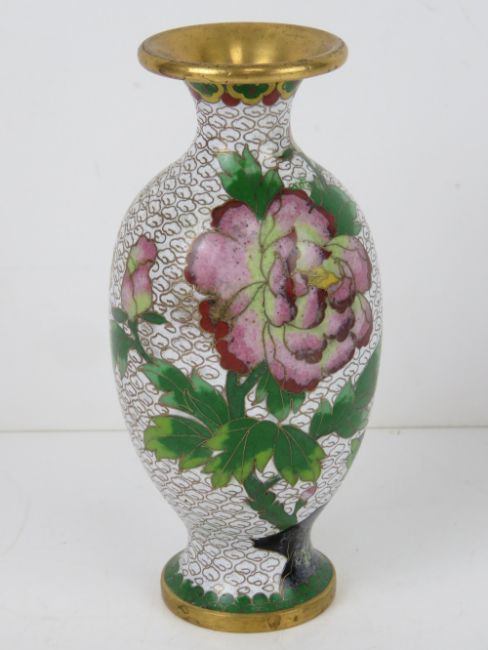 An early 20thC Chinese cloisonné Canton enamel vase, white ground having pink floral pattern upon, 18cm high.