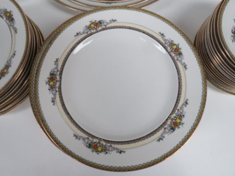 A large quantity of rare Art Deco style George Jones china dinnerware the 'Alhambra' pattern being an eight-place setting and spares comprising dinner plates, large and small plates, four graduating serving plates, two tureens (one lid deficient) and a small soup tureen with ladle.
