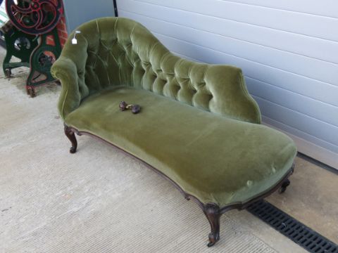 An Edwardian button back chaise lounge raised over shaped and scrolled legs. Old repair having come apart to front leg (parts present) all raised over brass castors, 180cm in width.