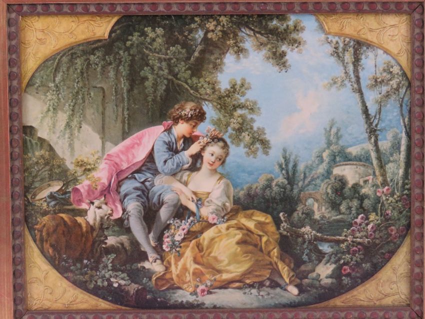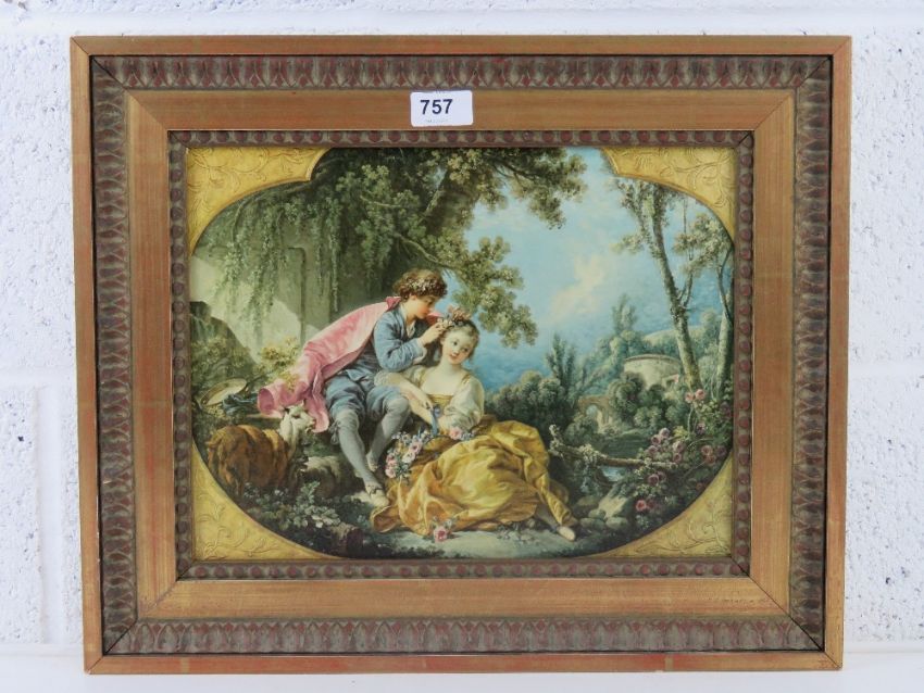 A lacquered print of a painting by Boucher entitled 'Spring', 34 x 26cm in ornate frame.
