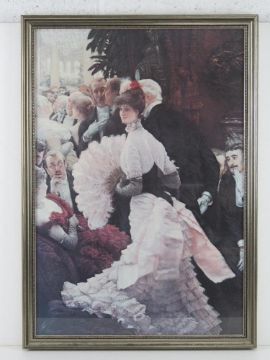 A print of a lady in fashionable dress of the period, party in background, framed.