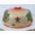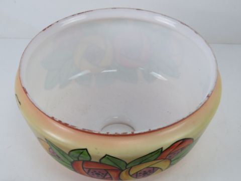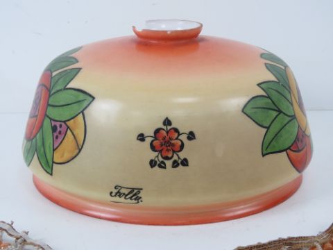 An early 20thC hand painted milk glass light shade marked 'Folly' upon, slightly a/f. Together with a hand made beaded fringe possibly Welsh.