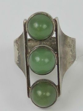 A 1970s style geometric three cabachon ring, no apparent hallmarks, size M-N.