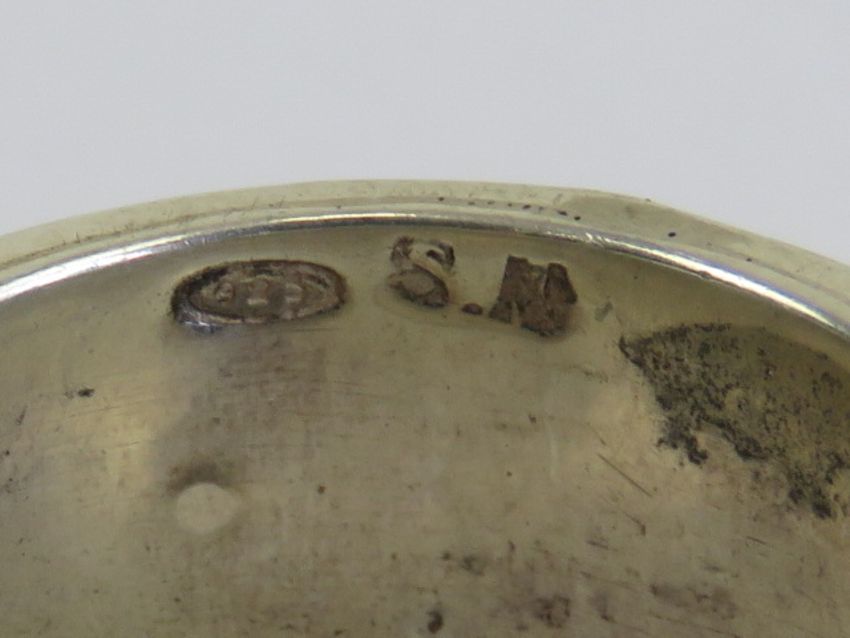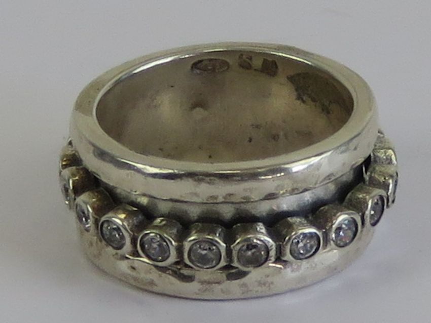 A worry ring (stress ring / fidget ring) having central white stone set rotating band, stamped 925 with makers mark, size O-P.