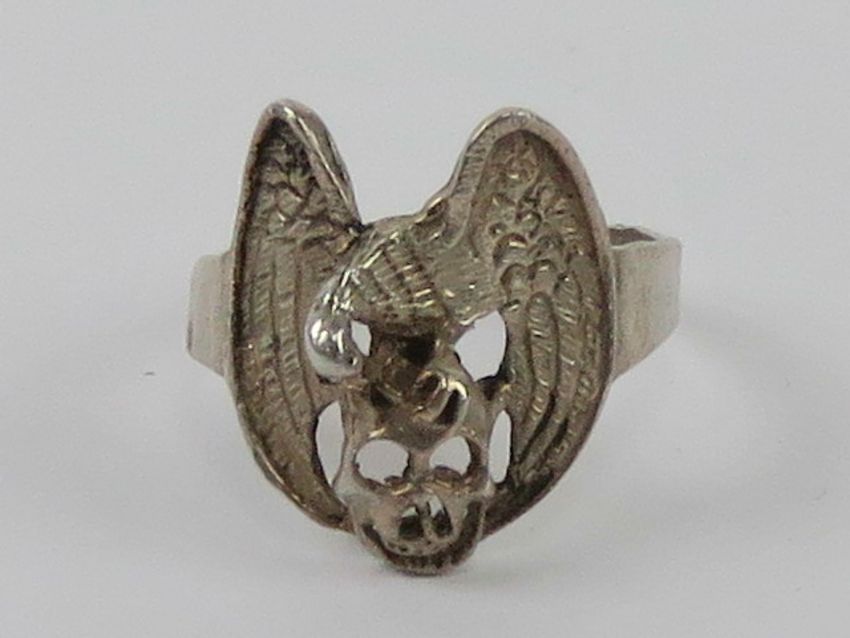 A silver ring of Gothic form being a vulture sat on a skull, stamped 925, size O.