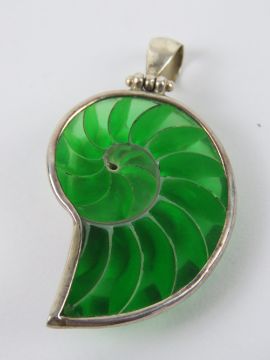 An unusual green acrylic and mother of pearl shell form pendant, 4.8cm inc bale.
