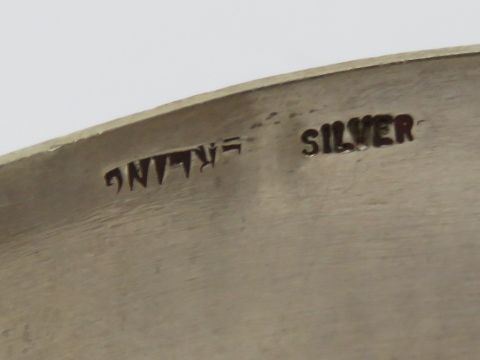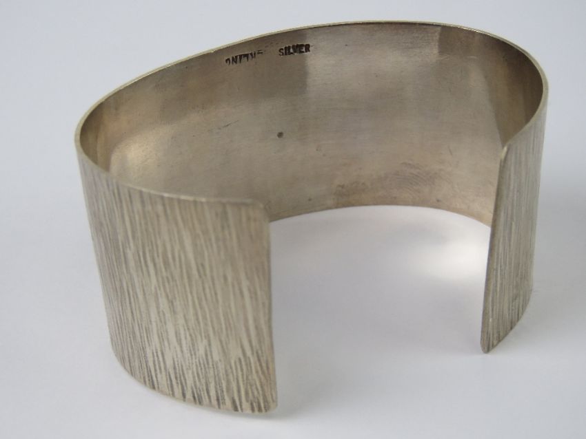 A 1970s style sterling silver bark effect bangle, 3.2cm wide.