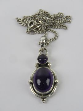 A silver and double amethyst cabachon pendant, stamped 925 and measuring 4cm inc bale, on substantial silver chain necklace.