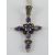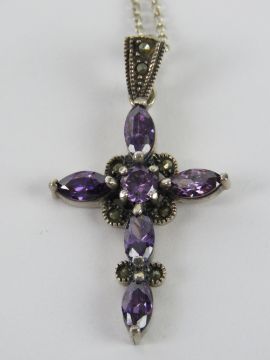 A Gothic silver crucifix set with purple stones and marcasites, 4.2cm inc bale, stamped 925, on silver chain, in presentation box.