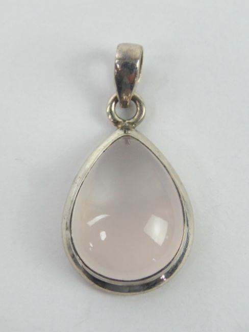 A rose quartz and silver teardrop shaped pendant, stamped 925, 3.4cm inc bale.