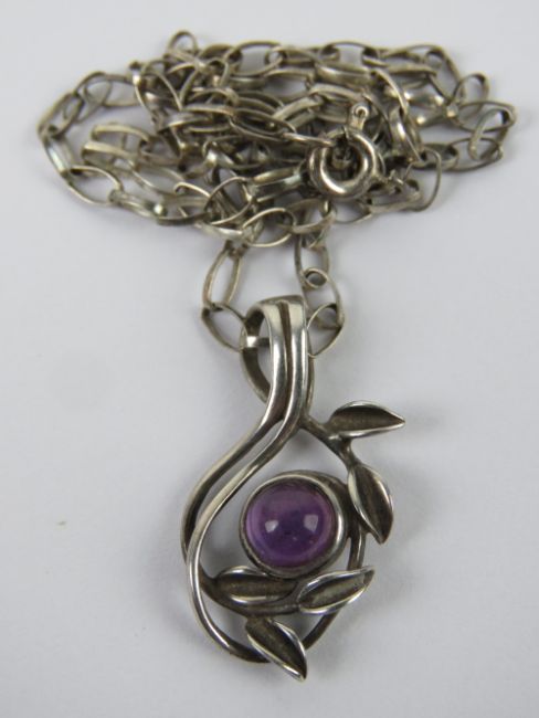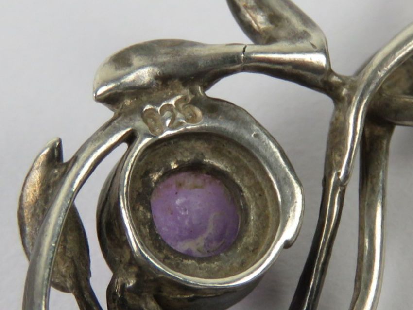 An amethyst and silver pendant of floral form, stamped 925 and measuring 2.7cm in length, on silver chain.