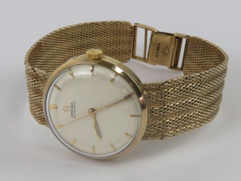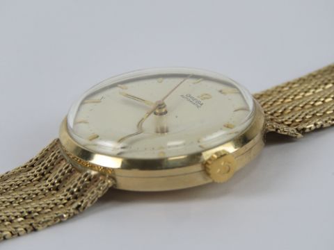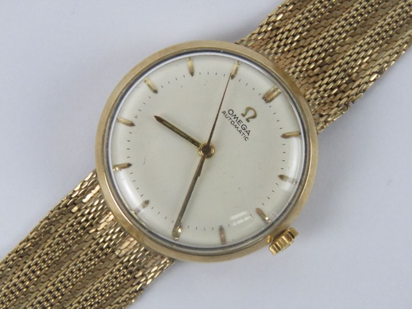 An Omega 9ct gold automatic wristwatch, cream dial with baton points, hallmarked 375 to the bracelet strap. Total weight 50.7g.