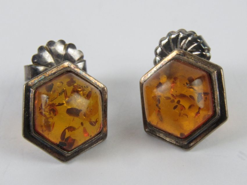 A pair of Baltic amber cabachon earrings having sterling (STG) silver butterfly backs.